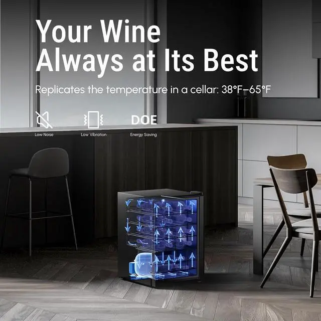 Thanks to the advanced R600A compressor and direct cooling technology, this wine cooler operates at a quiet 38dB, ensuring a peaceful environment while efficiently keeping your wine at the ideal temperature.