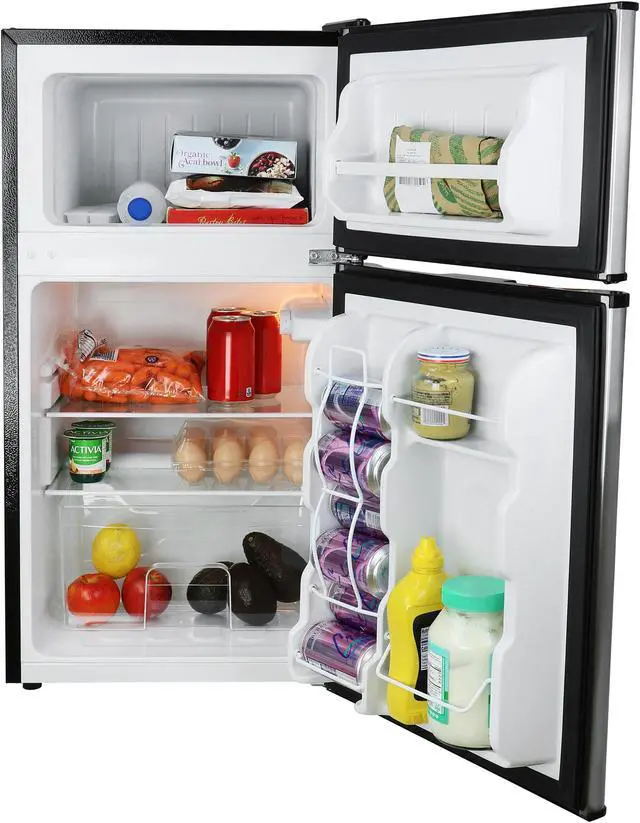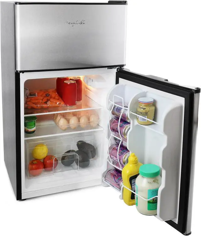 Keep all your food, snacks, beverages and veggies fresh and cool with the MegaChef 3.2 Cubic Feet Refrigerator/Freezer. 2 Door design is great for keeping your frozen food frozen while you explore your options in the refrigerator. This sleek and compact fridge is ideal for individual bedrooms, dorms, entertainment spaces, offices and everywhere else in between. Features adjustable glass shelves and adjustable temperature control and reversible door hinges.