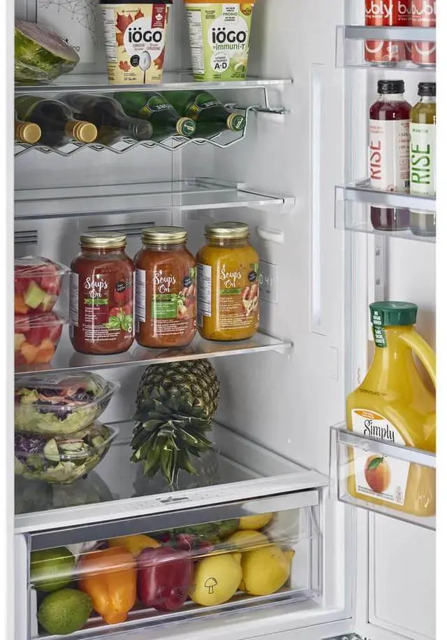 Keep your fruits and vegetables fresh longer with a deep, humidity-controlled crisper drawer that maintains the ideal environment for freshness, while the built-in fresh air filter helps eliminate odors and preserve quality. LED Side Lighting for Enhanced Visibility