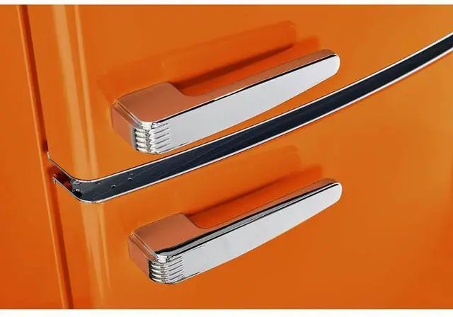 Create a nostalgic kitchen aesthetic with a sleek retro design, highlighted by chrome trim and robust zinc cast handles for a refined finish. Frost-Free Technology for Easy Maintenance