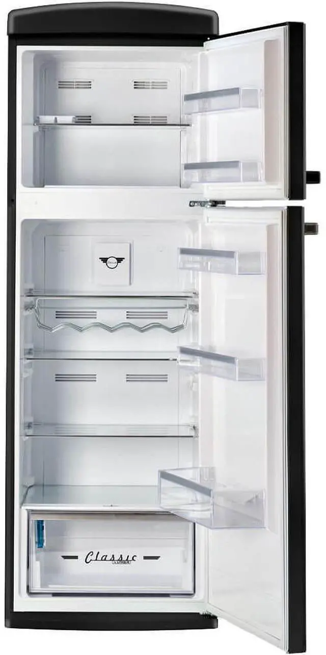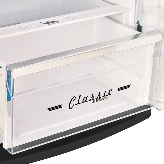 Timeless style meets efficiency in UNIQUE's 11 cu. ft. retro top-mount, Energy Star, frost-free refrigerator. Featuring chrome accents, LED display, adjustable glass shelves, frost-free cooling and Super Freeze Mode, it blends style with performance. Stay organized with a wine rack, ice tray, and humidity control crisper while the digital control panel and door alarm ensure convenience and peace of mind. Retro Styled Top Freezer Refrigerator