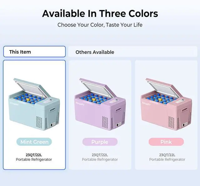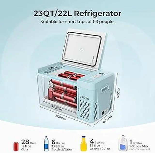 Fast Cooling Down to 32: With Compressor refrigeration technology, this 12v car refrigerator could achieve 15 min fast cooling from 77 to 32 and 50 min from 77 to -5, keeping your food fresh. No ice needed, no food spoiled, money and space-saving. Dimension: 22.68*12.60*15.53 in, Weight: 24.26 lb, lightweight