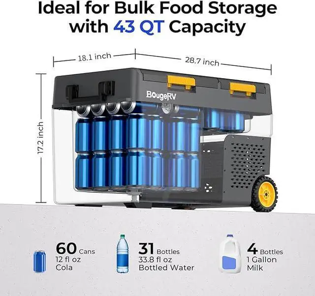 Wheels & Handle for Easy Transport: This portable Dual Zone fridge comes with wheels and a telescopic handle, making it easy to transport from your car trunk to your campsite. Equipped with a solar charging port (60W max, 12V 5A), you can pair it with the BougeRV 173Wh battery and BougeRV100W solar panel, extending its outdoor usage time