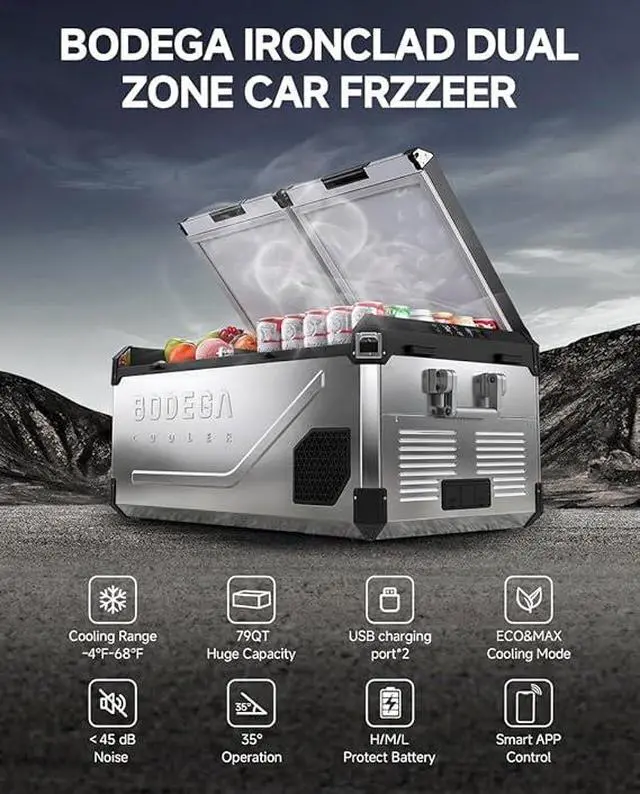 1. 79QT Large Capacity Dual ZoneBODEGA Aluminum Chassis withstands extreme road vibration and impacts. Dual independent zones (L: 48QT / R: 30QT | 79QT Total) maintain precise temps from -4°F to 68°F (-20°C to 20°C). Store 130+ cans, 85+ water bottles, or 30+ wine bottles with zero cross-temperature interference. Assign fridge/freezer roles per zone via App or manual override."
