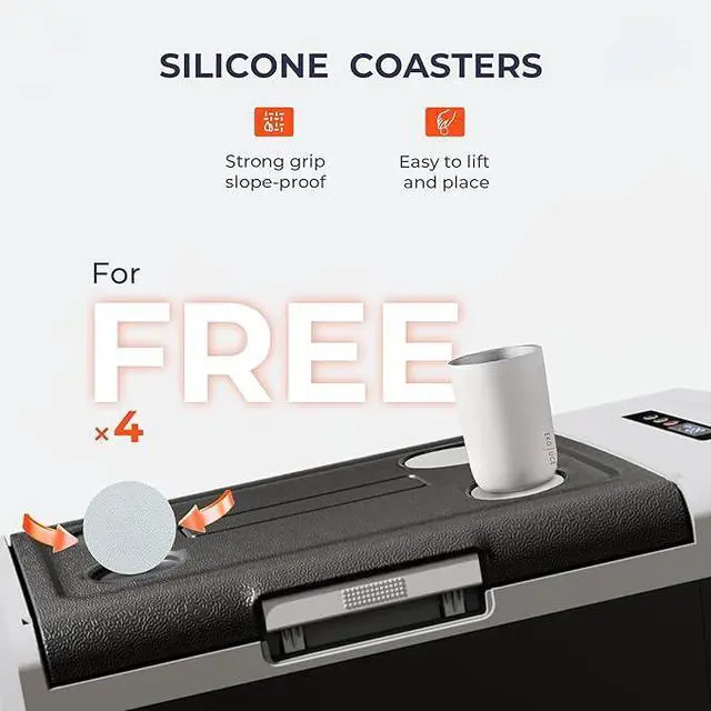 Battery Protection & Earthquake Resistance: The car fridge features low, medium, and high three-level battery protection to prevent the car battery from running out, automatically restarting when the voltage returns to normal. The 12 volt cooler features four slots that allow you to use four tie-down straps (sold separately) to securely fasten it in your vehicle, greatly enhancing its stability. Additionally, we include four silicone coasters to keep your drinks steady and make it easier to use