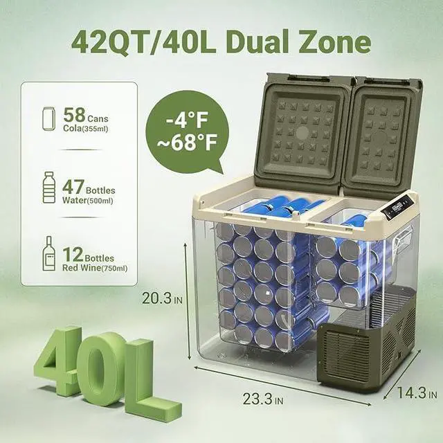 Powerful Capacity & Fast Cooling : The BODEGA 12 volt refrigerator is both compact and spacious, with a total capacity of 40 L (28.5 L large zone + 8.3 L smaller zone). It can hold up to 58 cans of cola or 47bottles of water. portable freezer achieves 15-minute fast cooling from 68 to 32 , ideal for quickly chilling drinks. It can double as a freezer or a refrigerator for truck drivers, boat owners, and campers to store seafood, snacks, meat, beverages, or any other travel essentials