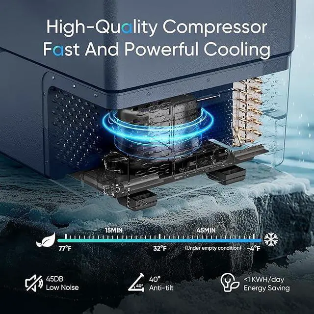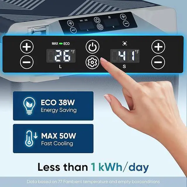 15 mins Fast Cooling & Low Power: The 12v cooler uses premium compressor tech, cooling from 77°F (ambient) to 32°F in 15 mins, down to -4°F in 45 mins. This car cooler has 3 modesECO saves energy, under 30W. Even Max (50W) uses far less than 1kWh/day with smart cycling.