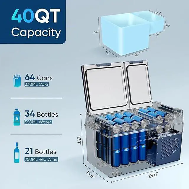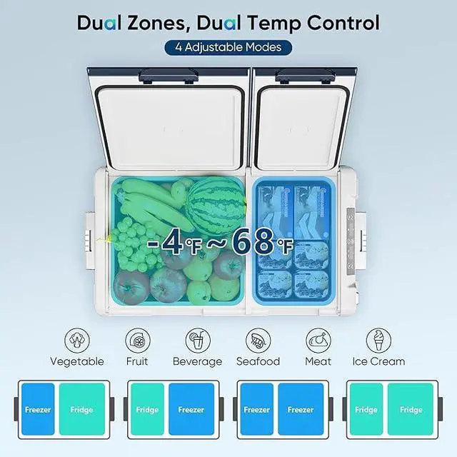 Dual-Zone Independent Control: This 12 volt refrigerator has 2 zones with separate temp control (-4°F to 68°F), preventing odor mixing and keeping food fresh. Easy-to-use control panel adjusts each zone simply. Perfects for truck/RV trips, boating, fishing, partythis electric cooler cools flexibly, meeting all your on-the-go needs, practical and convenient.
