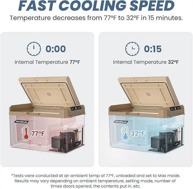15 mins Fast Cooling Down to 32With Smartele refrigeration technology, this 12v fridge could achieve 15 min fast cooling from 68 to 32 and 45 min from 77 to -4, keeping your food fresh. No ice needed, no food spoiled, money and space-saving.