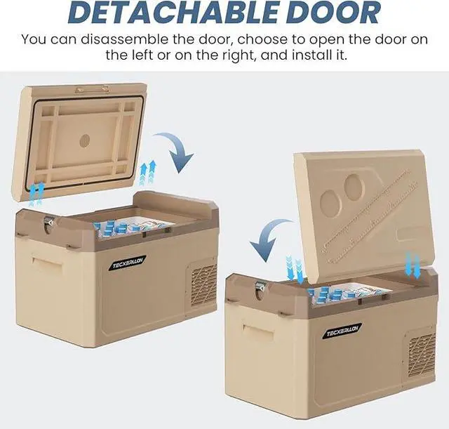 Portable & Easy Access with Removable DoorThe door of this car fridge is removable and can be repositioned according to your needs, making it more convenient for you to access your food and drinks while driving. This feature adds versatility, especially when you need quick access on the road or at a campsite.