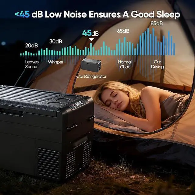Quiet 45dB Operation & All-Terrain Stable CoolingAt a library-quiet 45dB, this portable car refrigerator wont disrupt conversation or sleep. Four anti-shake anchor points keep it secure even on 40° slopes or rough roads, ensuring consistent cooling in motion.