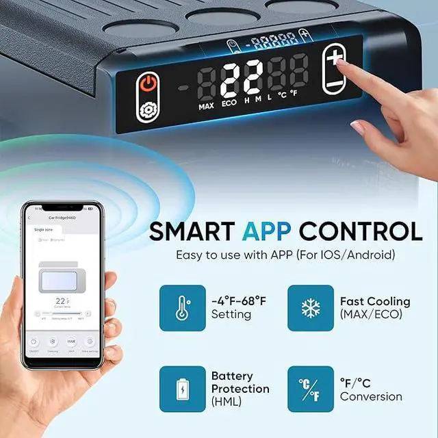 Smart APP Control & Hands-Free ConvenienceControl everything from your phone with this portable car refrigerator: remotely adjust temperature, switch between fridge/freezer modes, and monitor battery levelall without touching the electric cooler. Perfect when youre in the drivers seat, at your campsite, or away from the vehicle.