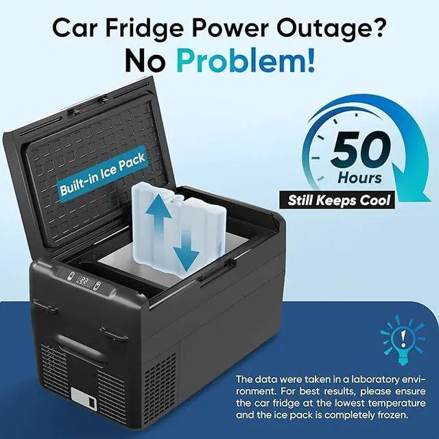 50-Hour Extended Freshness & Energy EfficiencyThis 12V refrigerator keeps your contents cold for up to 50 hourseven during outagesthanks to its ice pack and superior insulation. In ECO mode, this portable car refrigerator runs on only 28W (<1 kWh/day), delivering sustained cooling with minimal energy use.