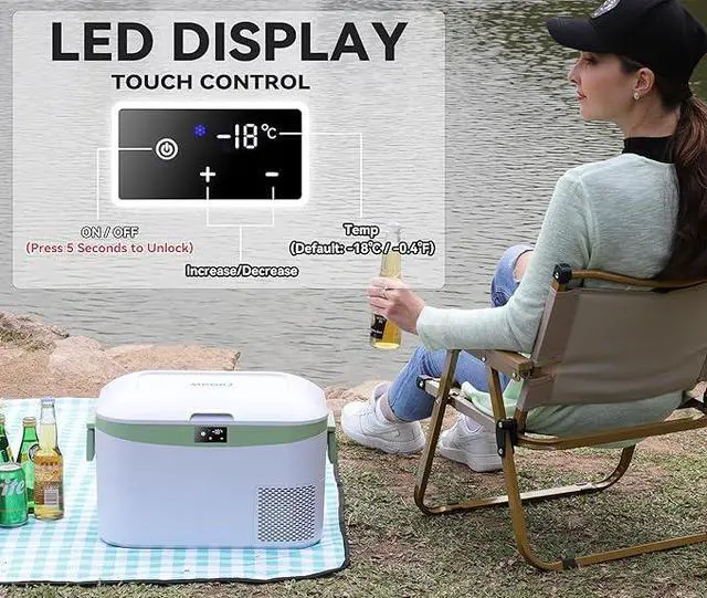 TOUCH CONTROL AND LED DISPLAY: Adjusting the temperature between -18 (-0.4) and +15 (59) on the Touch Screen; it can be a portable refrigerator or a portable freezer, the HIPS inner tank can hold not only food and drinks but also ice cream, meat, and other items; the round design of the fitting makes cleaning easy. The removable baskets can be your food tray