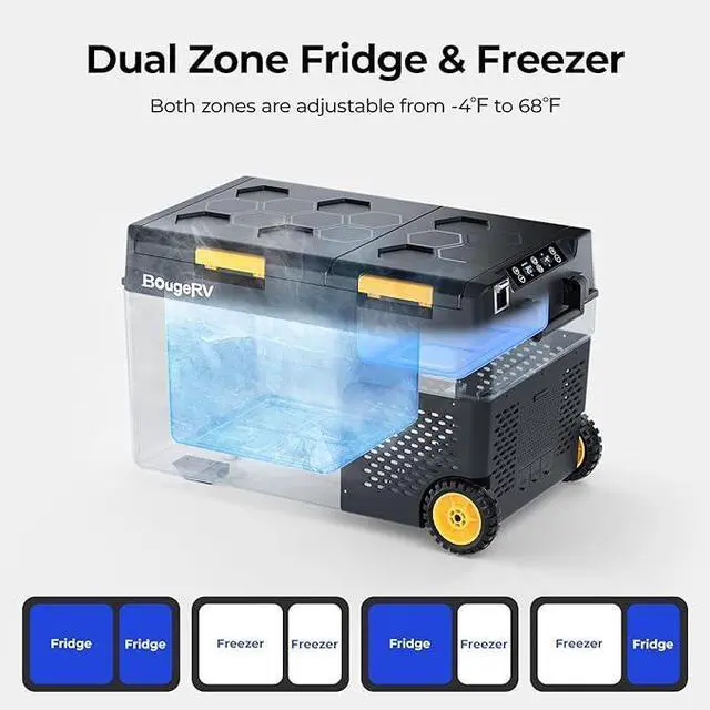 Dual Zone with Independent Temperature Control: This 12 volt refrigerator features two separate zones, each with adjustable temperatures from -4°F to 68°F, allowing for both cooling and freezing at the same time. It can be used as a combination of fridge/freezer, fridge/fridge, freezer/freezer, freezer/fridge to meet different food storage requirements