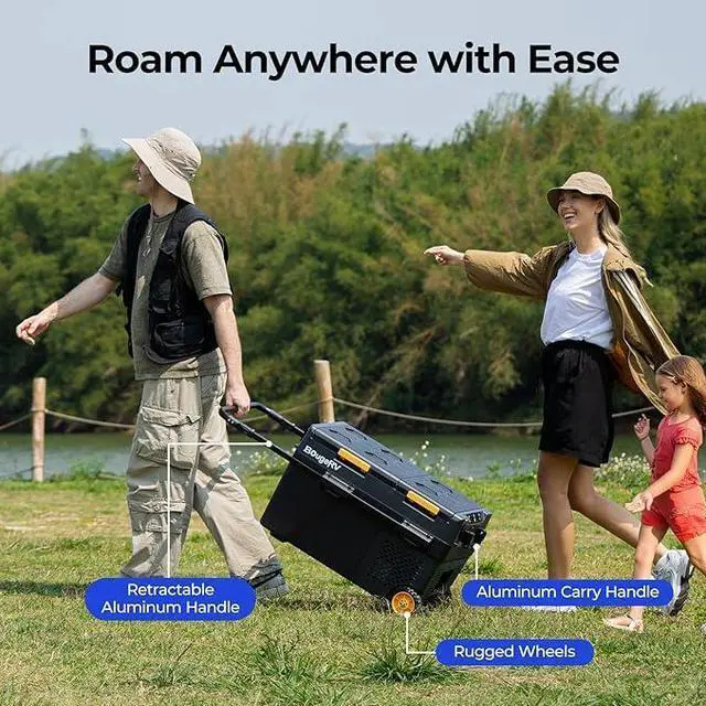 Wheels & Handle for Easy Transport: This portable Dual Zone fridge comes with wheels and a telescopic handle, making it easy to transport from your car trunk to your campsite. Equipped with a solar charging port (60W max, 12V 5A), you can pair it with the BougeRV 173Wh battery and BougeRV 100W solar panel, extending its outdoor usage time