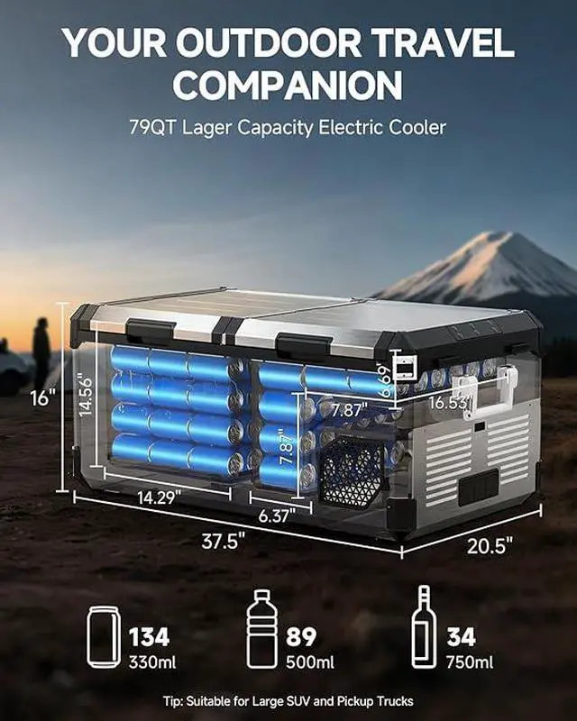 79QT Large Capacity Dual ZoneBODEGA Aluminum Chassis withstands extreme road vibration and impacts. Dual independent zones (L: 48QT / R: 30QT | 79QT Total) maintain precise temps from -4°F to 68°F (-20°C to 20°C). Store 130+ cans, 85+ water bottles, or 30+ wine bottles with zero cross-temperature interference. Assign fridge/freezer roles per zone via App or manual override."