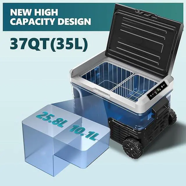 Dual Zones & Mobile Design; The portable refrigerator has two storage areas that can independently adjust the temperature and can be used as a refrigerator and freezer. This portable refrigerator has a large capacity of 35 quarts and a storage basket for easy storage and retrieval of all food.The 12 volt refrigerator comes with dual handles and off-road wheels, making it portable and easy to move, lightening your load on the journey