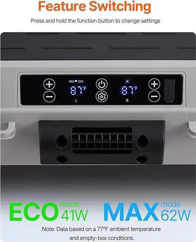 Compressor Cooling Speed: Using compressor cooling, the 12V electric cooler can drop temps from 68°F/20°C to 32°F/0°C in about 25 minutes to help keep food fresh during travel. ECO mode supports efficient daily use, while MAX mode offers quicker cooling whenever needed on the road