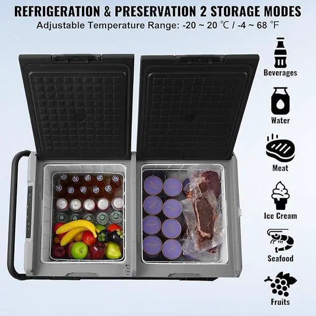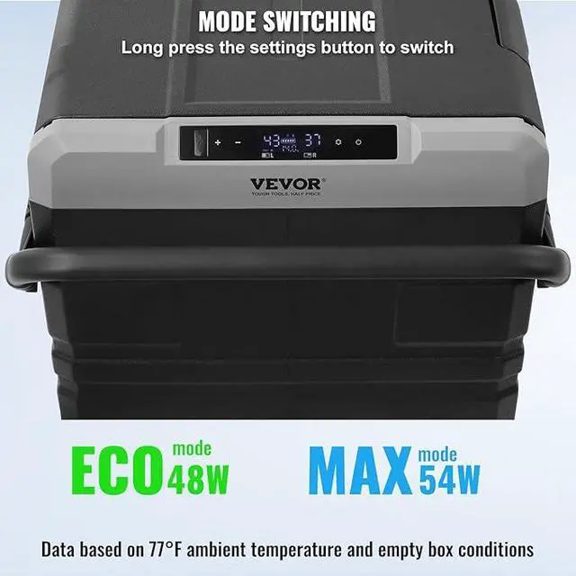 Compressor Cooling Speed: Using compressor cooling, the 12V electric cooler can drop temps from 68°F/20°C to 32°F/0°C in about 25 minutes to help keep food fresh during travel. ECO mode supports efficient daily use, while MAX mode offers quicker cooling whenever needed on the road