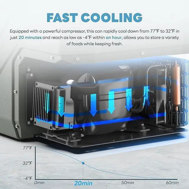 EFFICIENT COOLING: Powered by an upgraded inverter compressor, this plug in cooler can rapidly cool down from 77 to 32 in just 15 minutes, and to -4 within an hour, far more than the performance of a thermal electric cooler. Fast cooling really matters.