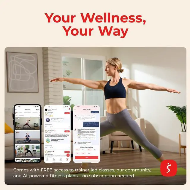 Yes. It includes workout guidance and routines available through the companion app. No extra subscription is required.