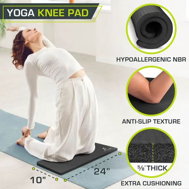 Enjoy a pain-free yoga practice with the ProsourceFit Yoga Knee Pad to protect your sensitive pressure points. The 15mm thick knee cushion is made of high den-sity NBR foam to give you just the right amount of comfort without being too thick to maintain balance when youre working out on the floor. The mat-width pad fits on any standard yoga mat and aligns perfectly along the edges of your mat so it wont mess up your flow like messy blankets or folding up your mat can, but is great for much more than yoga. The ProsourceFit Yoga Knee Pad provides cushion to your knees, elbows, wrists, sit bones, and head whether youre in camel pose in yoga or boat pose in Pilates. It can also be used for floor workouts and stretching, a knee pad when using an ab wheel, or even as a seat cushion on hard surfaces. At 24x10 inches, the compact and lightweight design is perfect for taking with you anywhere from the studio, gym and hotel room. NBR material is ribbed for a non-slip design, is waterproof and easy to clean, so you can even take it to hot yoga. This is a great option for anyone with latex allergies, because it is latex free. There are also no phthalates for a safe mat you can depend on. Availa-ble in 6 colors (aqua, black, blue, grey, pink, purple) to suit your unique yogi style.