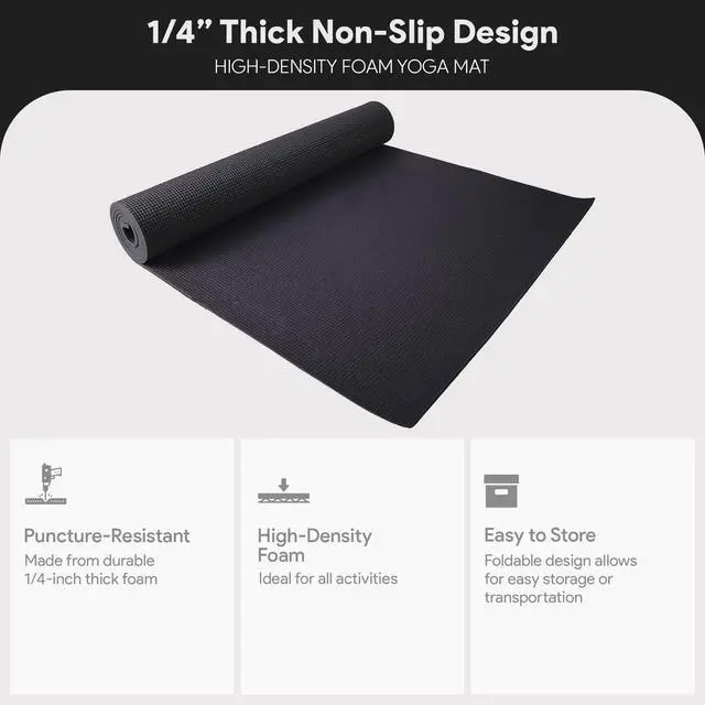With high density foam material, the 1/4'' thick premium mat comfortably cushions spine, hips, knees and elbows on hard floors.