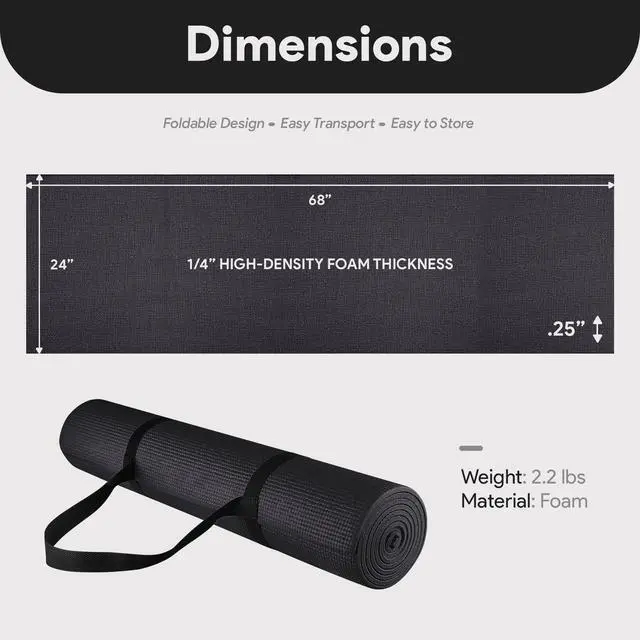 68" long 24" wide ensures comfort for people of all shapes and sizes. With high density foam material, the 1/2'' thick premium mat comfortably cushions spine, hips, knees and elbows on hard floors.