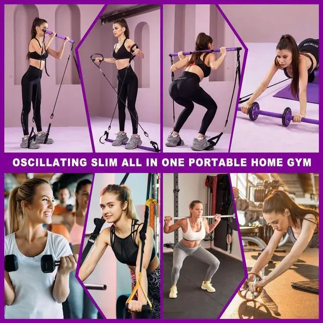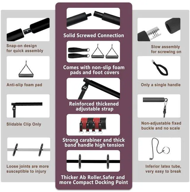 Ultimate Pilates Bar SystemThe unique Pilates equipment completes a revolutionary innovation with a combination of detachable 3-bar and abdominal roller to complete regular Pilates training, plus the perfect abs workout, 8 high quality resistance bands, 4 20-inch and 4 28-inch. It Can meet 5' 1-6' 5 height people enough resistance training
