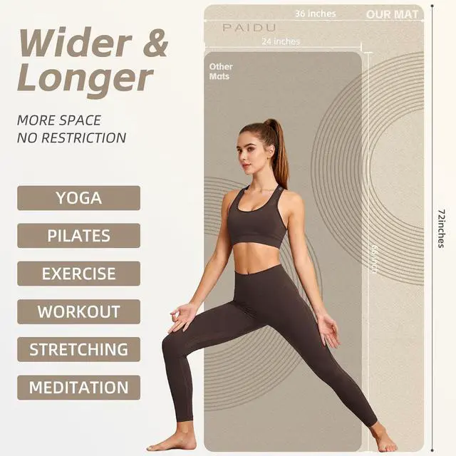 Large Yoga Mat: The yoga mat measures 72" in length and 40" in width, ample space allows you to stretch out comfortably without feeling confined. It is designed for tall yogis and the people who require more room to do yoga pose, Pilates, stretching and workouts, etc.
