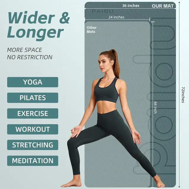 Large Yoga Mat: The yoga mat measures 72" in length and 40" in width, ample space allows you to stretch out comfortably without feeling confined. It is designed for tall yogis and the people who require more room to do yoga pose, Pilates, stretching and workouts, etc.
