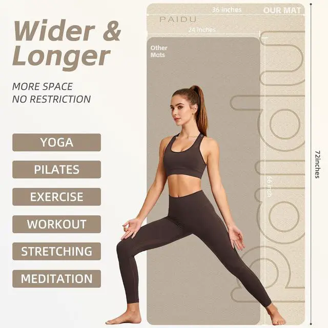 Large Yoga Mat: The yoga mat measures 72" in length and 40" in width, ample space allows you to stretch out comfortably without feeling confined. It is designed for tall yogis and the people who require more room to do yoga pose, Pilates, stretching and workouts, etc.