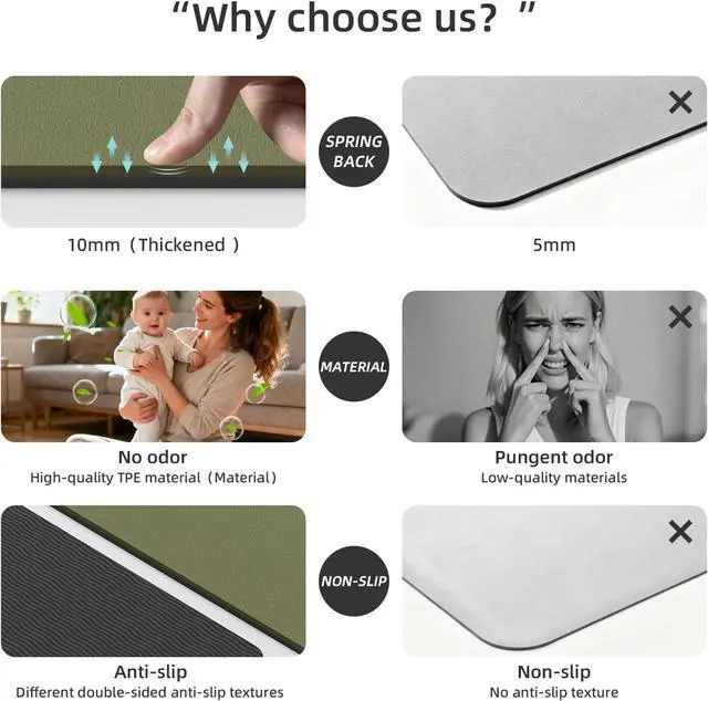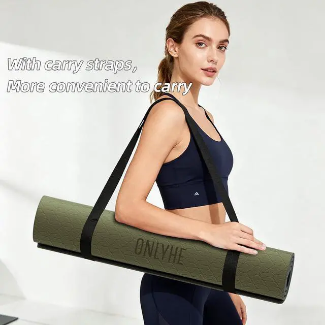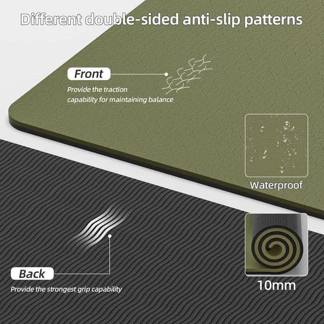 Increased size and thicknessThe size of ONLYHE yoga mat is 72"x35"x10mm. The thickened yoga mat can better protect the limbs and reduce the pressure on joints, knees, etc. You can do various yoga poses on the yoga mat with confidence