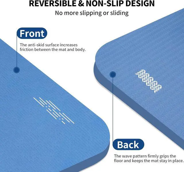 Non-slip & Reversible Design: The anti-skid surface increases the friction between the mat and body which can prevent your hands, knees and feet from slipping during practice. The wave patterns on back firmly grip the floor ensure the mat stay in place.