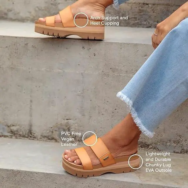 • Different strap material options include super soft unlined PVC Free vegan leather two strap slide, synthetic braid instep strap, or synthetic woven raffia with scalloped edge detail