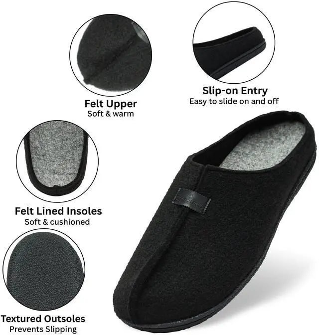 DESIGN – The upper is crafted from soft and warm felt and accented with a faux leather logo tab. The slip-on entry allows you to easily slide these on or off. The clog design with the high back prevents your foot from sliding out.