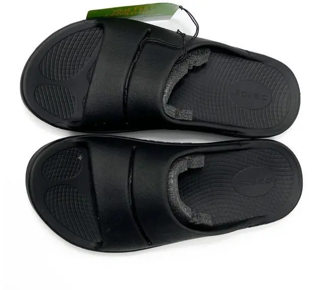 These 1100-BLK OOFOS Unisex OOAHH Slides are after-sport footwear and more, made of our breakthrough OOfoam. Holds tight and conforms to your foot to ensure incredible impact absorption, arch support and natural motion.