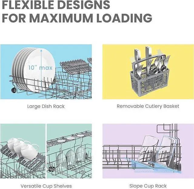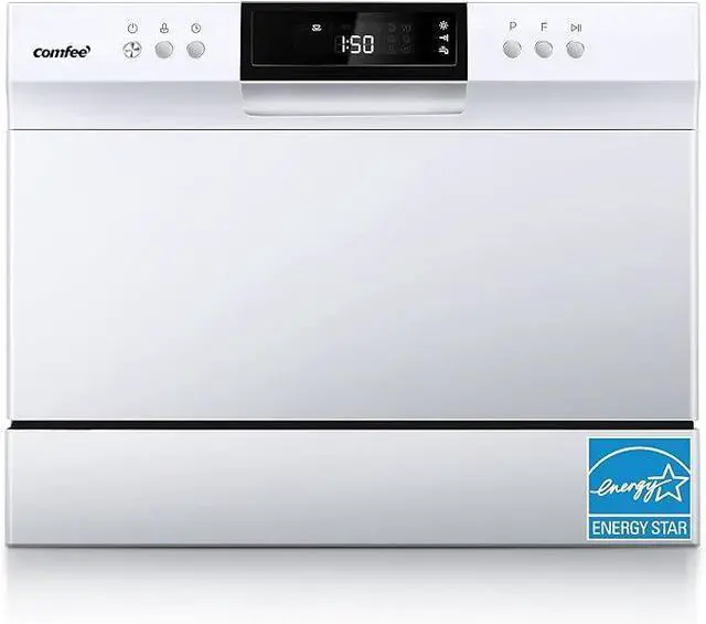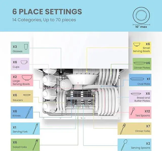 6 Place Setting- A perfect size (H17.2×W21.6×D19.7) for 2-3 people, COMFEE compact dishwasher is suitable for dorms, RVs, and apartments. This countertop dishwasher can fit up to 70 pieces of tableware and has a plate size of up to 10 inches in diameter. Note: COMFEE dishwashers are tested at the factory before they are shipped. If your new dishwasher has some water inside, this is normal.