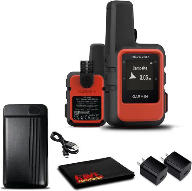 Bundle Items Include: 1 x Garmin inReach Mini 2 Satellite Communicator (Flame Red) 1 x Battery Charging Bank (10000 MAH) 1 x USB Cable Charger2 x USB Charging Adapter1 x 6Ave Cleaning Cloth1 x Carabiner