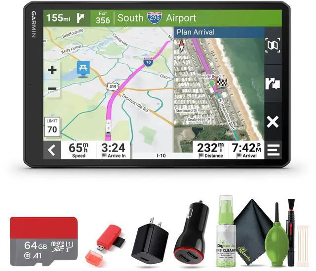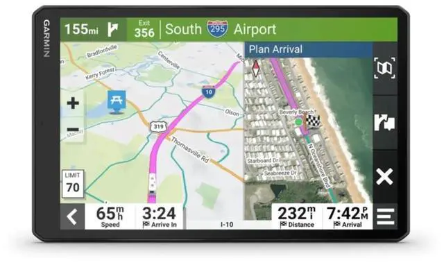 The RV 1095 GPS navigator is specifically designed for RV owners who want a smooth, worry-free journey. Featuring a large 10 high-resolution touchscreen, the RV 1095 displays your route clearly in both portrait and landscape modes. It offers custom routing based on the size and weight of your RV, ensuring that every trip is optimized for your vehicle. Preloaded with maps of North America, it includes road warnings for steep grades, sharp curves, and more, so youre always prepared for the road ahead. With BirdsEye Direct Satellite Imagery, youll enjoy vivid aerial views of your campsite or RV park, making arrivals easier than ever.