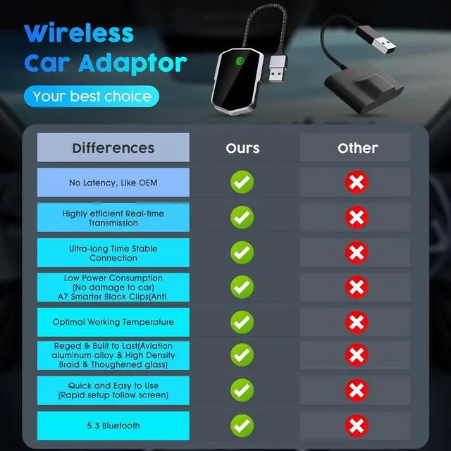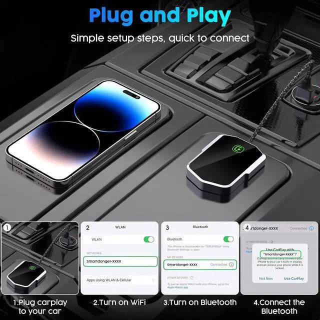 UNIVERSAL COMPATIBILITYThis carplay wireless adapter is compatible with 800+ car models (OEM wired cars), covering major car brands and popular vehicles. Equipped with USB to USB-C Adapter - Whether your car's wired CarPlay port is USB or USB-C type, you can rest assured that you can use our wireless Apple CarPlay