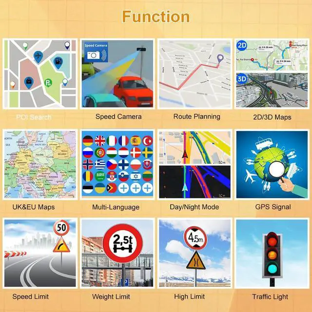 Practical GPS NavigationThis 7 inch GPS navigation has 7 vehicle modes between Car/ Truck/ Pedestrian/ Bicycle/ Emergency/ Bus/ Taxi. Customize better routes for you and avoid roads such as width/height/weight restrictions. And Providing Intelligent current speed camera alerts, sound warning and route planning, telling estimated arrival time.