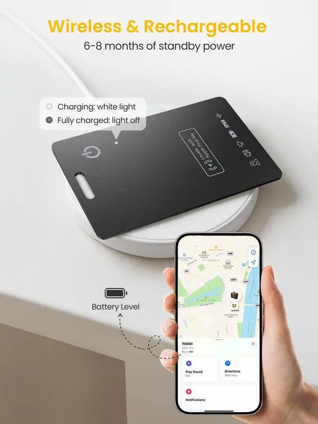 Designed to fit effortlessly into your life, this air tag for wallet is as slim as a credit card, sliding easily into any wallet, passport sleeve, or bag pocket without bulk. Its also IP68 waterproof and dustproof, ensuring reliable performance in rain, travel, or outdoor adventures. A wirelessly rechargeable battery lasts up to 68 months per charge, ready whenever you are.