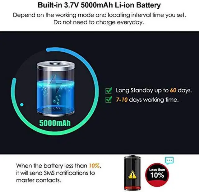 It has built-in 3.7V 5000mAh Li-ion battery, the standby time is 50 days and the working time is up to 5-10 days.