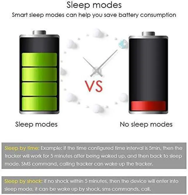 - Sleep mode by time: After this setting, the tracker will only work for 5 minutes after waking up and it will go back to sleep mode. The GPS will turn off and the GSM will work in low power mode. SMS, call can wake up the tracker.