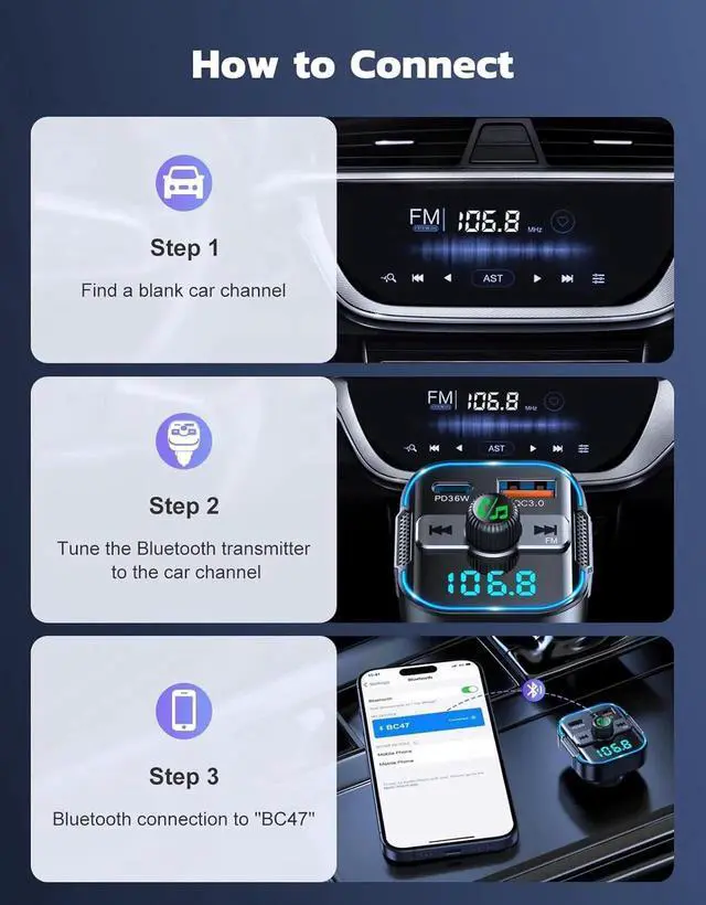 The car Bluetooth transmitter features dual USB Type-C ports (PD 36W & QC 18W) for simultaneous fast charging -- 5 times quicker than standard chargers. With intelligent safety functions, you can charge securely and efficiently without concerns about overcharging, overloading, overheating, or short circuits.