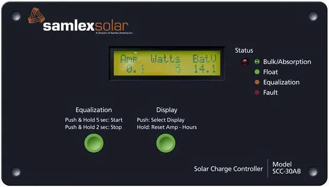 30 amp flush mount solar charger controller. Programmable with LCD display. Features include 8 charge settings for different battery types, battery equalization option, for use with 12V or 24V system - automatically detects, LED status lights indicate 4 stage battery charging. This controller can operate up to 500 watts of solar power.