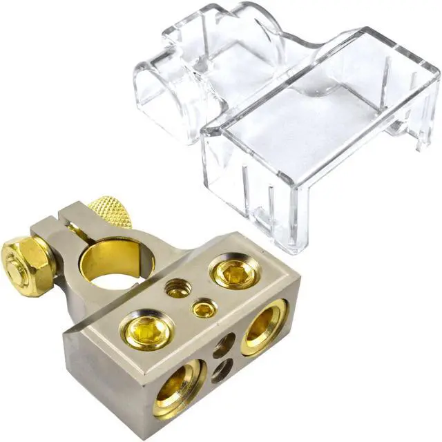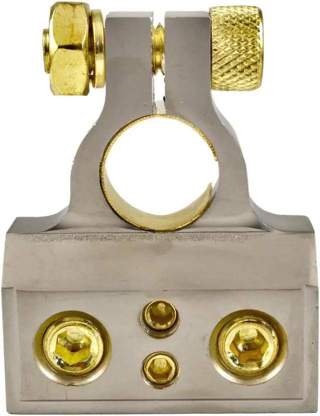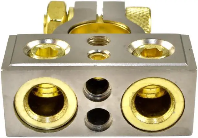 The superior performance PBT20428 universal battery terminal comes with a positive/negative adapter and has one 0/1 AWG, one 4 AWG and two 8 AWG outputs. The highly conductive platinum finish of the PBT20428 is designed for high current applications and maximum power delivery.