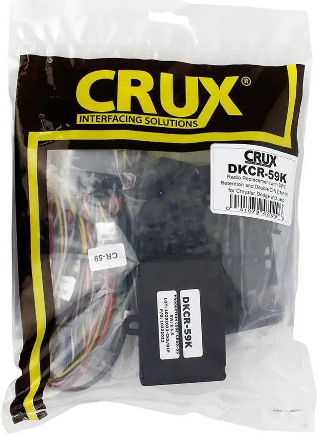 The Crux DKCR-59K is a replacement radio interface and double DIN dash kit for Select Chrysler, Dodge, and Jeep Vehicles. It facilitates the integration of an after-market radio to fully retain factory features in CAN Bus vehicles with amplified and non-amplified systems. This enhanced interface is pre-programmed for the retention of steering wheel controls. It also includes a double-din dash kit. Please see below for more features and compatibility.